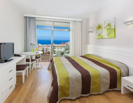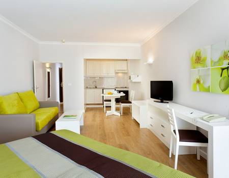 Superior Studio sleeps 4: The bright studios, complete with double bed (two twin beds pushed together) and sofa bed, are a spacious place to retire to after a day of fun-filled activities. With modern decor and amenities, you will have everything you need in one place including satellite TV, kitchenette, balcony and bathroom with shower and hairdryer.